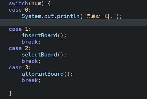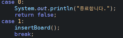 하지만 break; 가 없으므로 조건과 관계없이 case 1: 로 넘어가서 insertboard() 메서드 까지 작동하게 된다.