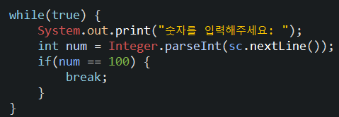 반복마다 사용자의 입력을 받으면서 해당 num을 출력하고 입력받은 값이 100인지 확인힌다. 사용자가 100이라는 입력을 하지 않을경우 계속해서 입력을 받고 100을 입력한다면 조건문을 통한 break가 작동되어 while문이 멈추게 된다.