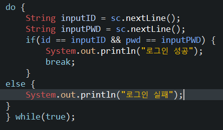 로그인에 성공하고, 그게 아니라면 로그인 실패문구를 띄우고 다시 do의 명령문을 반복하게 된다.