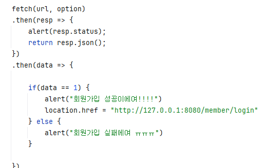 그리고 fetch 함수를 통해서 서버에 회원가입 요청을 보내고 서버측 join() 메서드가 끝나면 resp를 응답받는다. ResponseEntity.status를 통해서 resp에서 status 추출이 가능하므로 alert() 메서드를 통해서 상태를 출력하고 다시 body에 담았던 결과에대한 데이터는 data로 설정하여 조건문을 통해서 성공과 실패에 대해서 메세지와 포워딩 해줄지 말지를 결정한다.