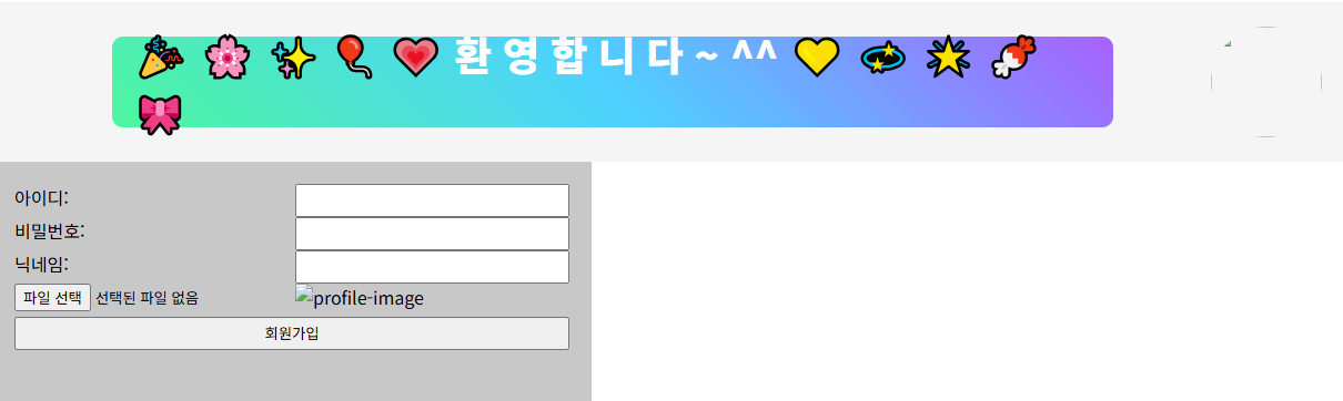 회원가입 페이지가 다음처럼 되어있을때 회원가입은 충분히 되지만 파일을 선택했을 때, 미리보기 기능이 있으면 좋을 것 같다. 그래서 파일 선택 인풋 태그에 onChange 메서드를 통해서 파일이 등록되면 사진을 보여줄 수 있도록 하는 기능을 js로 구현이 가능하다.