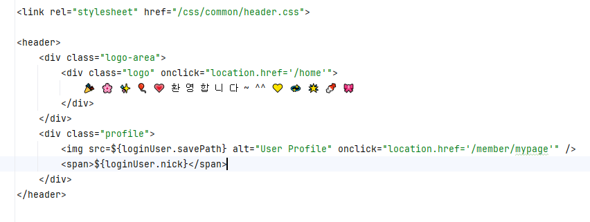 그리고 헤더.jsp 파일에서 세션에 있는 파일 경로를 img태그의 src 속성으로 넣어주고 닉네임도 참조해서 불러오면 된다.