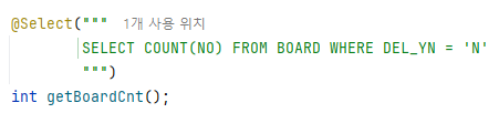listCount는 Mapper에서 다음과 같은 sql 구문으로 전체 글 개수를 반환받을 수 있다.